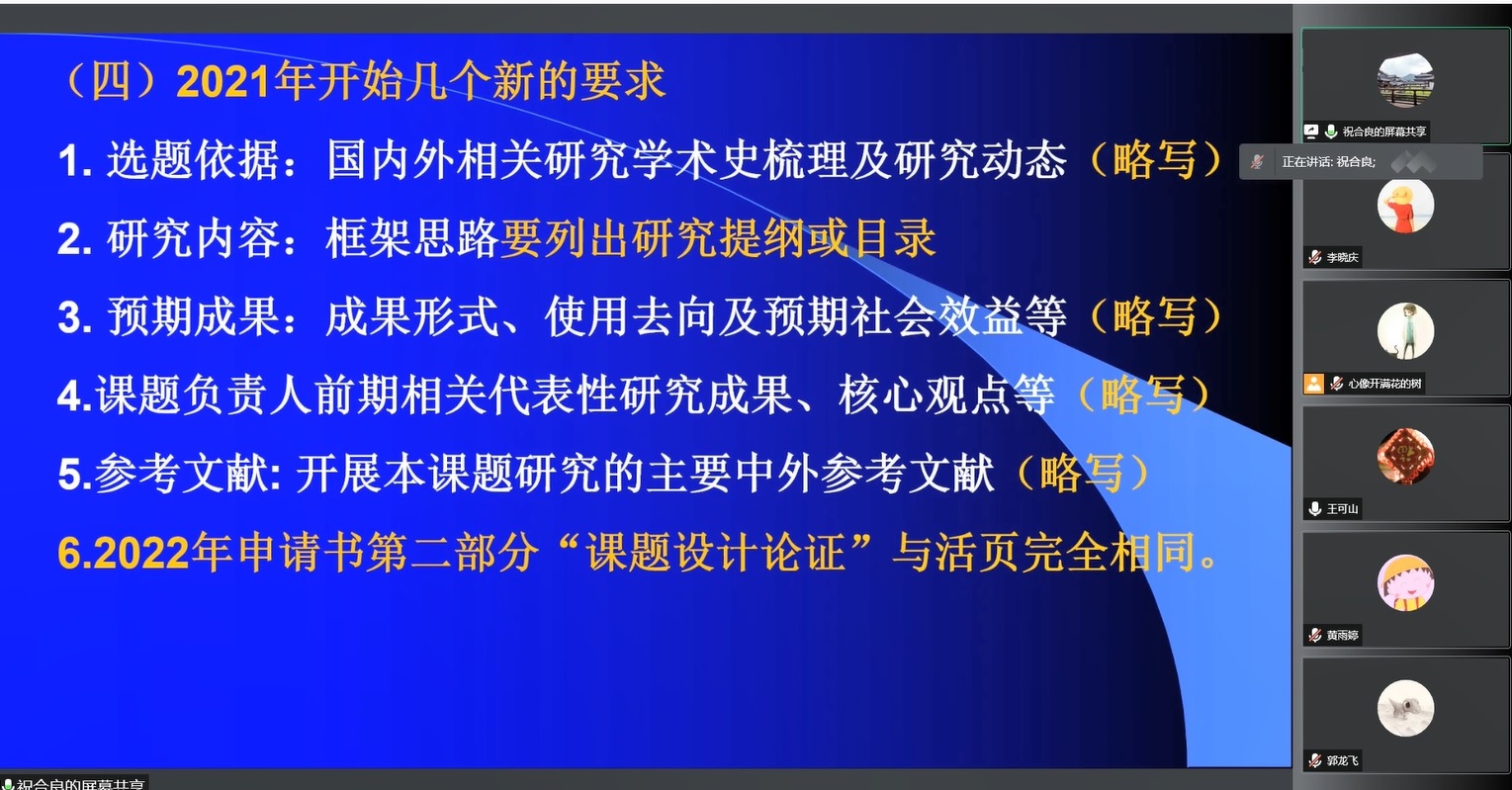第一个环节:专家讲解新政策,分享宝贵经验。胡海峰教授介绍了2022年“国家社会科学基金项目”最新的政策,建议多从国家大政方针、社会热点中寻找选题,研究要服务于国家重大战略需求;在文献综述上要做到“综、梳、述、评”,确保涵盖了选题相关领域最全面、最系统的观点、理论与研究进展。林发勤教授分享了近两年国家自科项目申报的改革措施与申报注意事项,建议自科项目的申报书要有够重感。祝合良教授分享了国家社科基金下的八类项目,重点对年度项目申报的主要内容进行了解读。王可山教授建议青年项目申报人要聚焦具体问题,明确研究对象。四位专家分享的内容丰富全面,给参会的教师带来了宝贵经验。