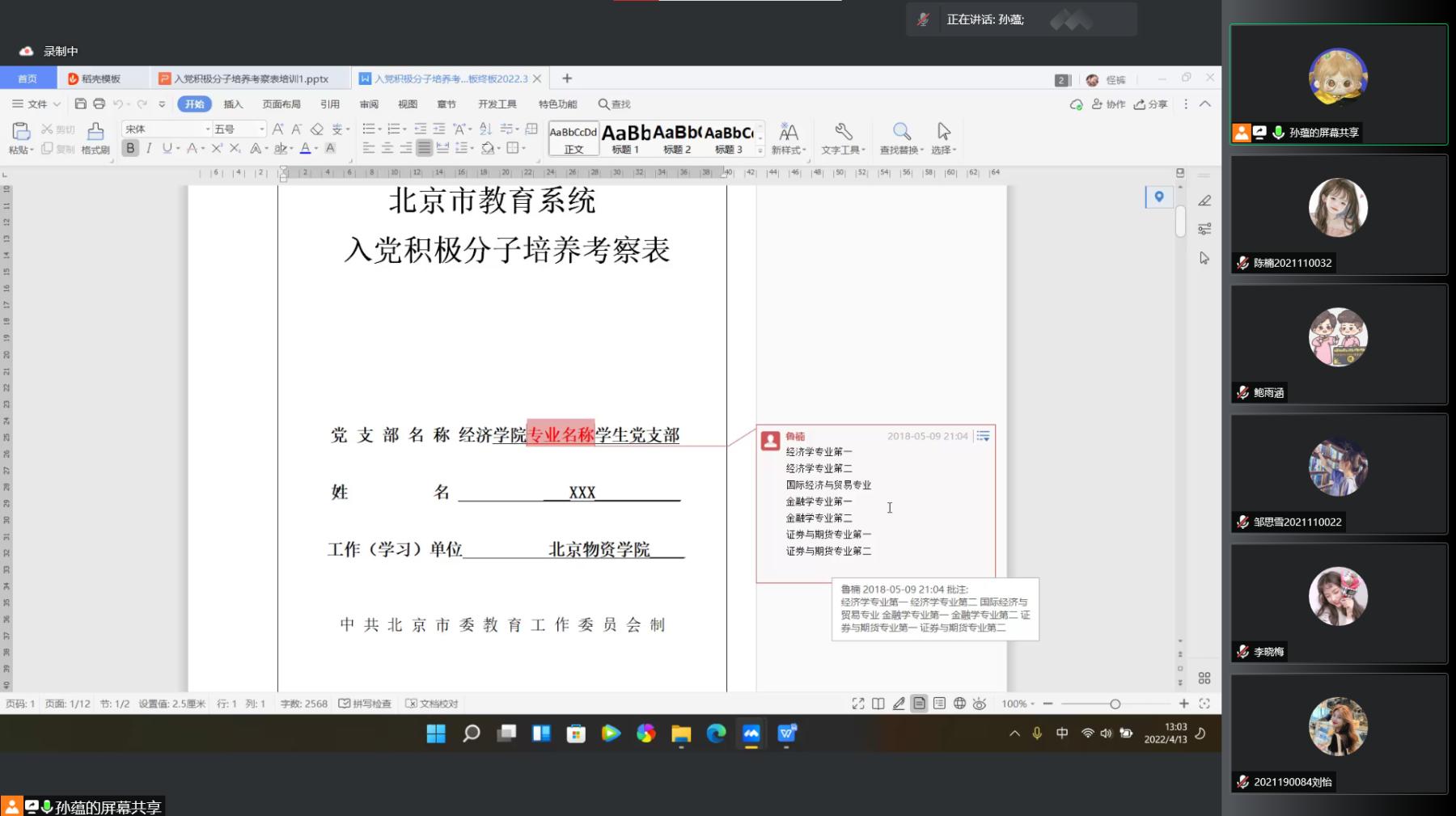 孙蕴同学着重讲述了入党积极分子的确定和党组织对积极分子培养考察的程序和内容。细致地讲解了《入党积极分子培养考察表》填写规范并逐一回答同学们的提问。