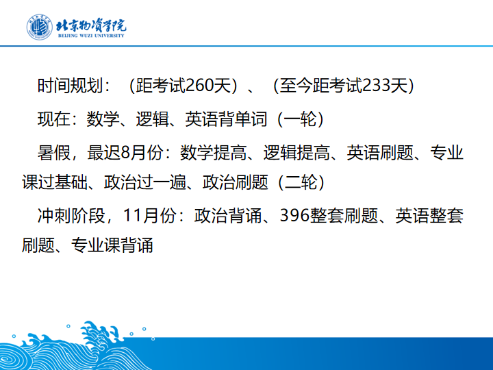 接下来,由艾圣轶学长进行分享,今年他成功考取公司物流公司研究生。他对如何选择目标院校、专业的冷热度、自身兴趣爱好和水平、是否需要报辅导班等问题进行了解答。根据自身的经历,他也为同学们提供了宝贵的经验。第一,要多做练习题和模拟题,达到非常熟练的境界;第二,在考前要安排模拟考试,把握住时间和节奏;第三,考前做好充分的准备,例如英语考前背诵写作模板;第四,要把时间和效率平衡好,使效率最大化,不做无用功。