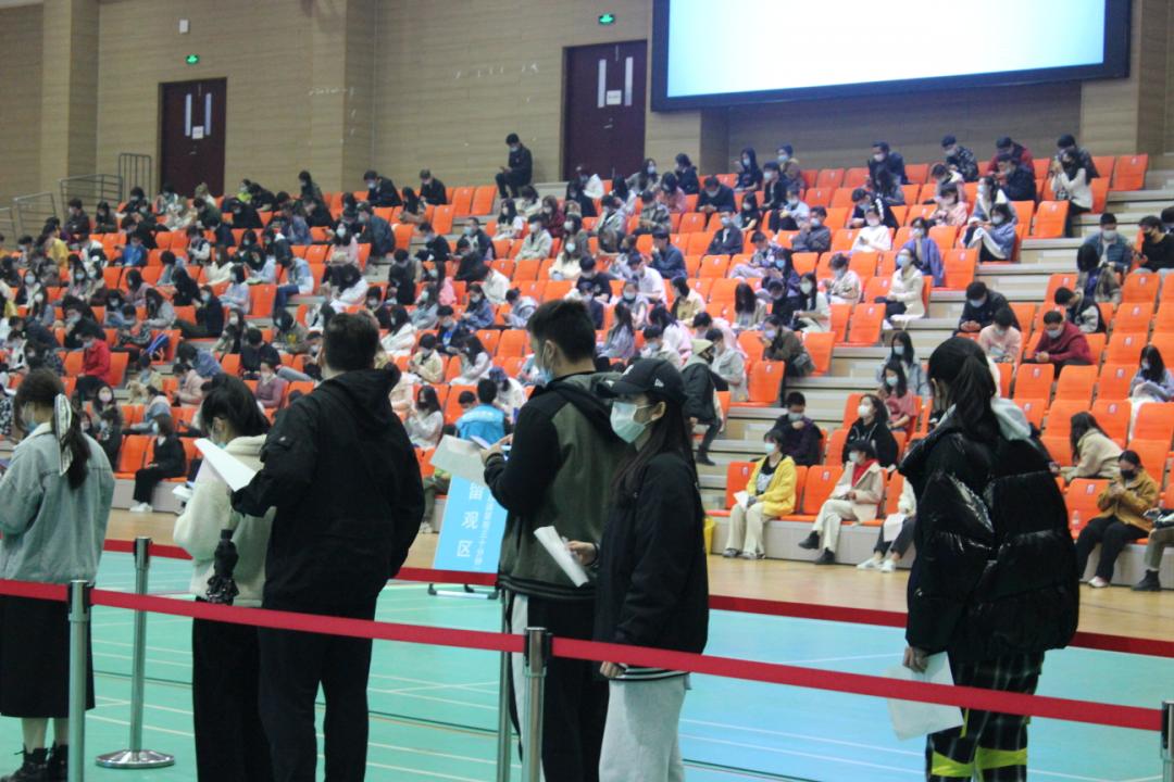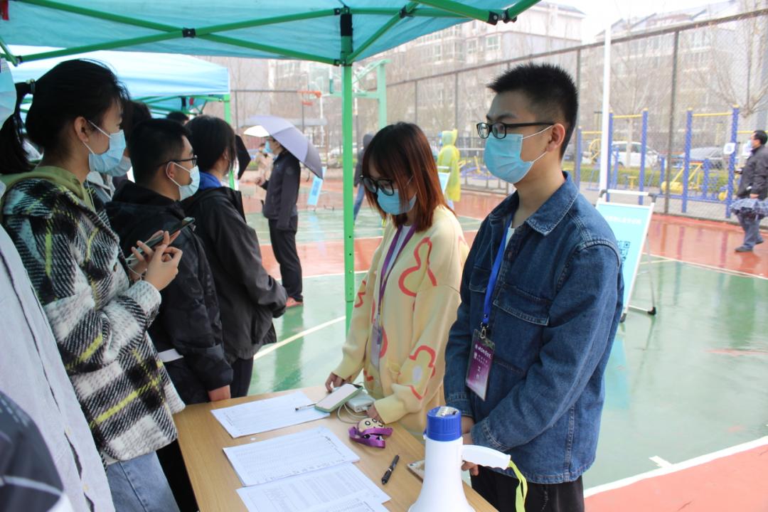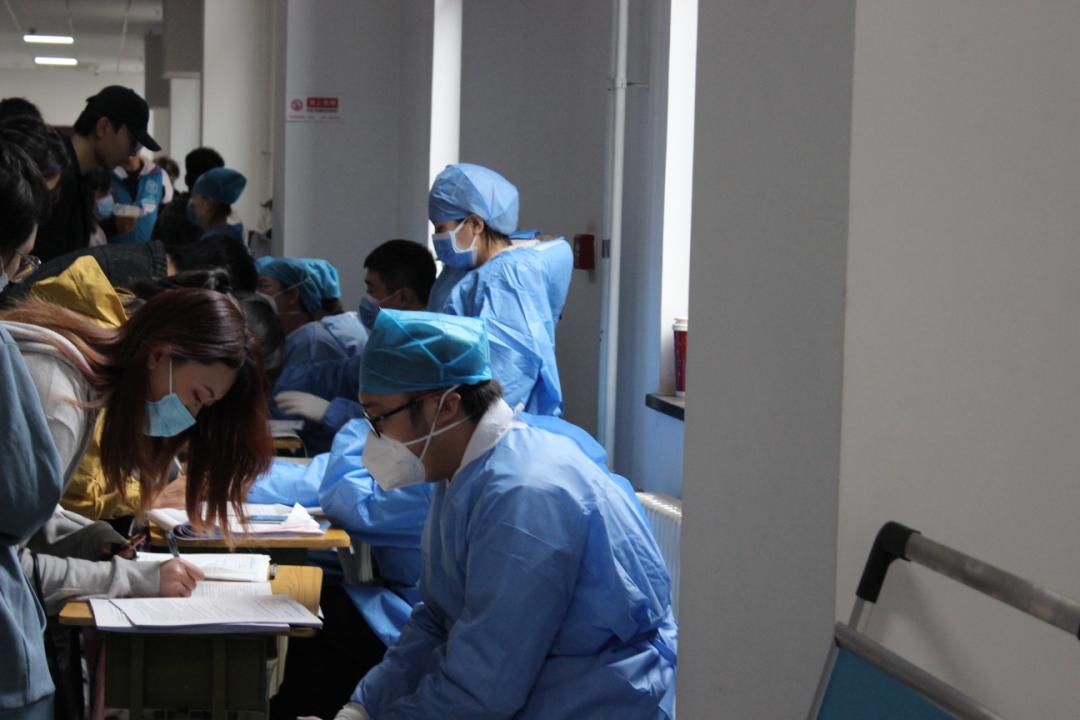 现场的师生们有序排队登记等待接种第一针,工作人员和志愿者在各自的岗位上尽心地服务着每一位师生。