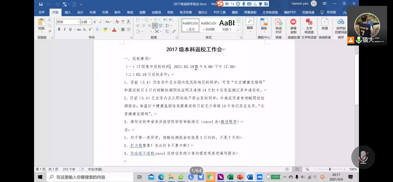 为进一步有效落实球盟会2021春季学期员工返校工作整体安排,同时深入推进2017级本科毕业生就业工作,2021年3月4日晚20.00,qm球盟会通过腾讯会议云在线方式召开2017级本科返校暨就业工作培训会。qm球盟会经理张国胜、公司党委副书记毛文富、公司2017级专职辅导员姚昊炜及2017级全体本科生参加了会议。会议由姚昊炜老师主持。